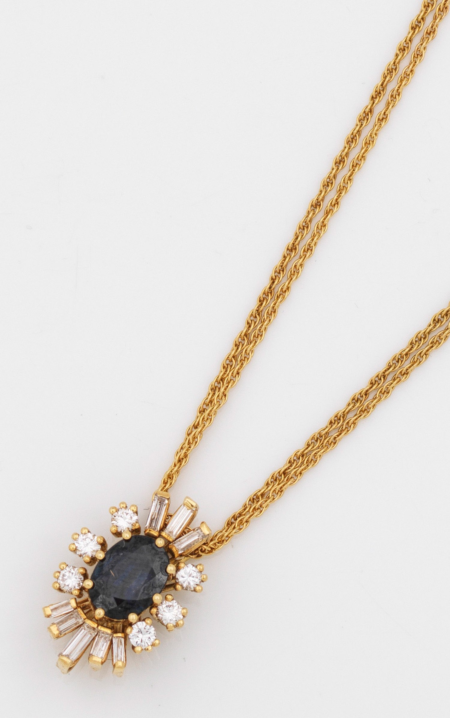Gelbgold, gest. 750. Zentral besetzt mit einem tintenblauen Saphir von ca. 1,68 ct., entouriert von Diamanten von zus. ca. 0,42 ct. (w/si) und Diamantbaguetten von zus. ca. 0,37 ct. (w/si). Feine, zweireihige Doppelankerkette. Ges.-Gew. ca. 8,52 g.