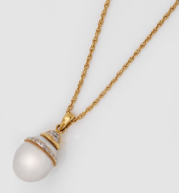 Gelbgold, gest. 750. Silberweiße Südseeperle von ca. 10 mm in farbintensivem, rosé-grün changierendem Lüster, besetzt mit Diamanten von zus. ca. 0,16 ct. und 0,74 ct. (vvsi/w). Feine Doppelankerkette. Ges.-Gew. ca. 5,37 g.