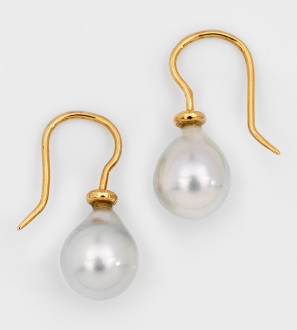 Gelbgold, gest. 750. Schauseitig besetzt mit einem silberweißen Akoyaperltropfen von ca. 9 mm in sehr farbintensivem, rosé-grün changierendem Lüster. Gew. ca. 3,53 g.