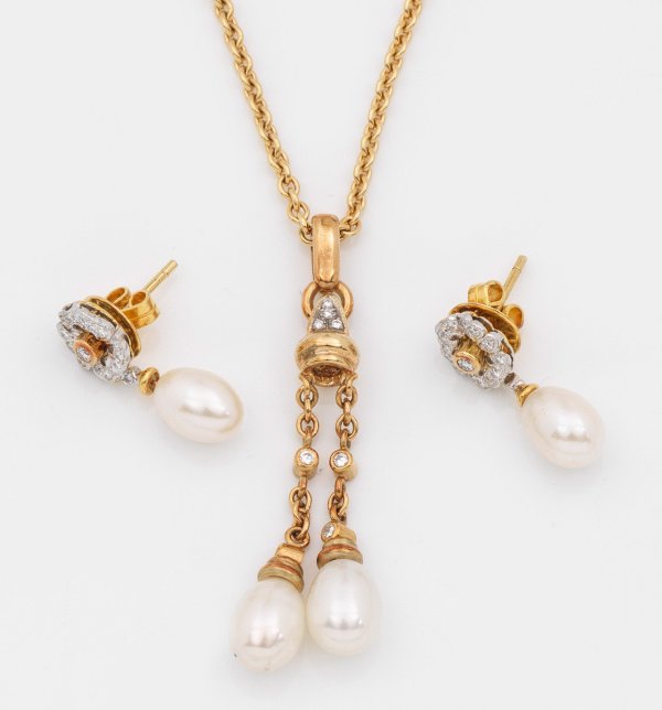 Paar Ohrgehänge und Anhänger mit Kette. Gelbgold, gest. 585 und 750. Besetzt mit weißen Süßwasserperltropfen von ca. 7,5 mm in farbintensivem, rosé-grün changierendem Lüster, akzentuiert durch Diamanten von zus. ca. 0,35 ct. (vvsi/w). Die Ohrringe auch als Diamantsolitär-Ohrstecker tragbar. Ges.-Gew. ca. 16,90 g.