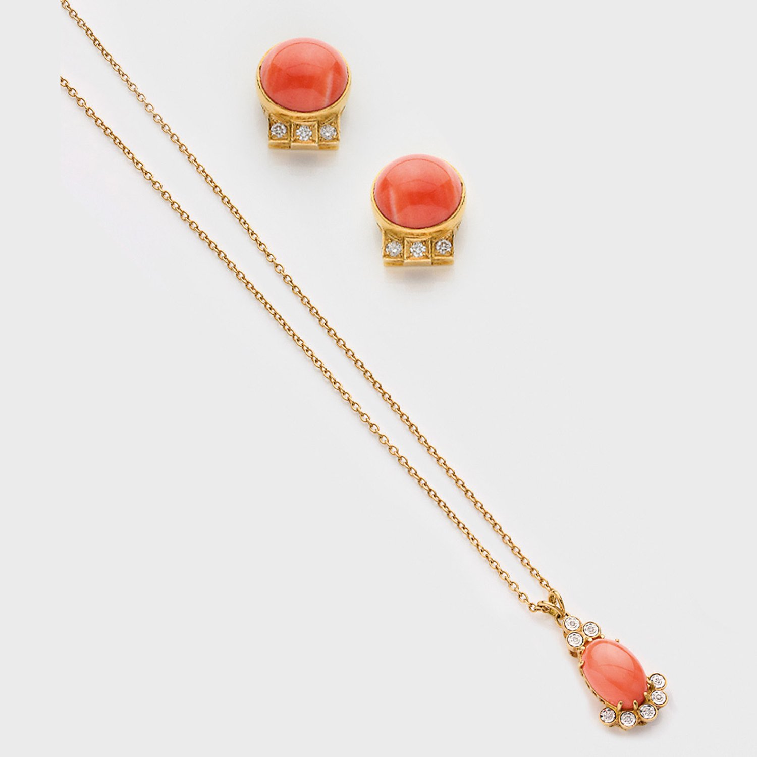 Paar Ohrringe und Anhänger mit Kette. Gelbgold, gest. 750. Anhänger besetzt mit ovalem, lachsfarbenem Korallen-Cabochon und Diamanten von zus. ca. 0,10 ct. (p/w). Die Ohrringe je besetzt mit einem runden, lachsfarbenen Korallen-Cabochon, entouriert von Brillanten von zus. ca. 0,11 ct. (vsi/w). Ges.-Gew. ca. 15,50 g.