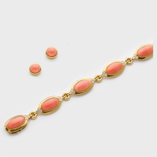 Armband und Paar Ohrringe. Gelbgold, gest. 585 und 750. Armband besetzt mit fünf ovalen, lachsfarbenen Korallen-Cabochons, entouriert von Brillanten von zus. ca. 2,16 ct. (vvsi/tw). Ohrringe besetzt mit korrespondierenden, runden Korallen-Cabochons. Ges.-Gew. ca. 40,00 g.