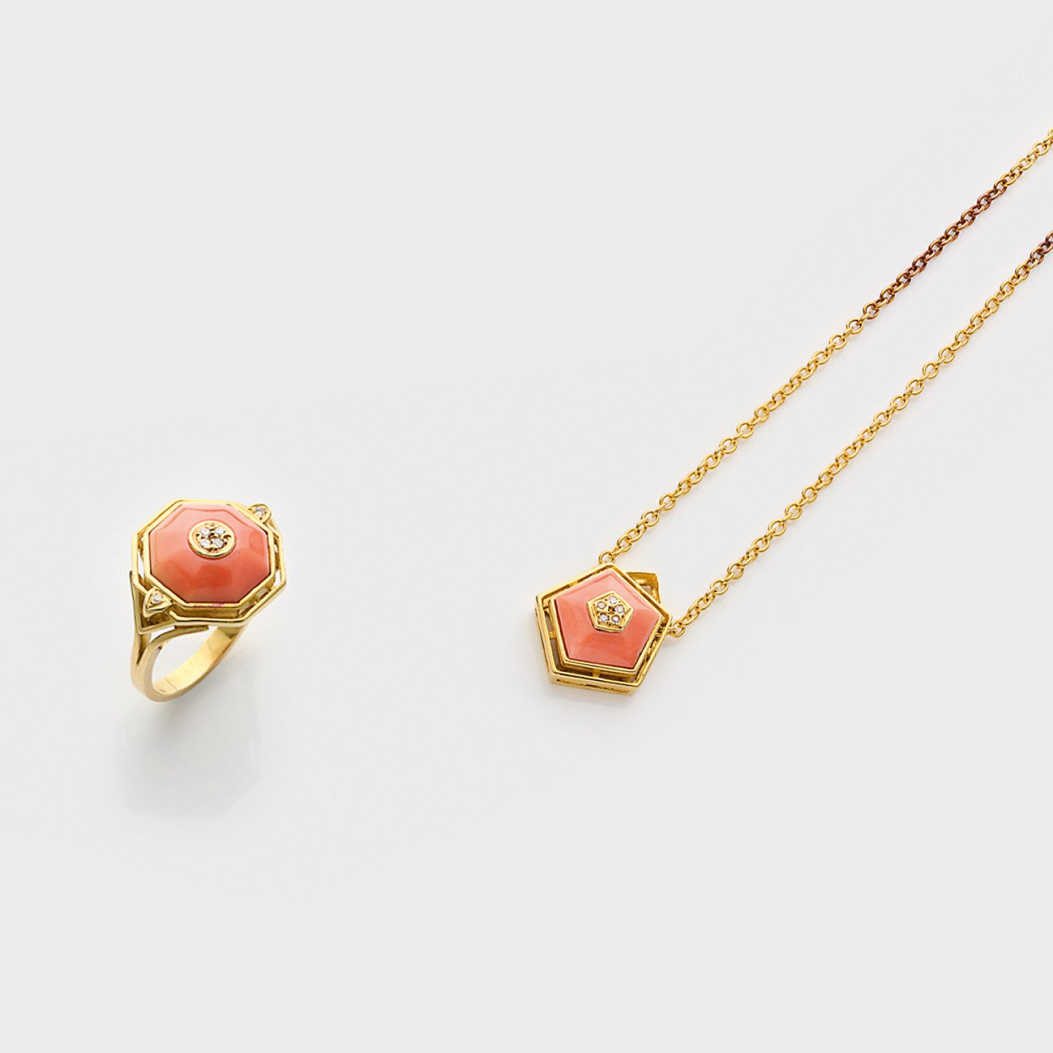 Pendant and ring set with salmon corals and diamonds approx. 0,13 ct. (vsi/w), in 18 k gold. Necklace in 18 k gold.
