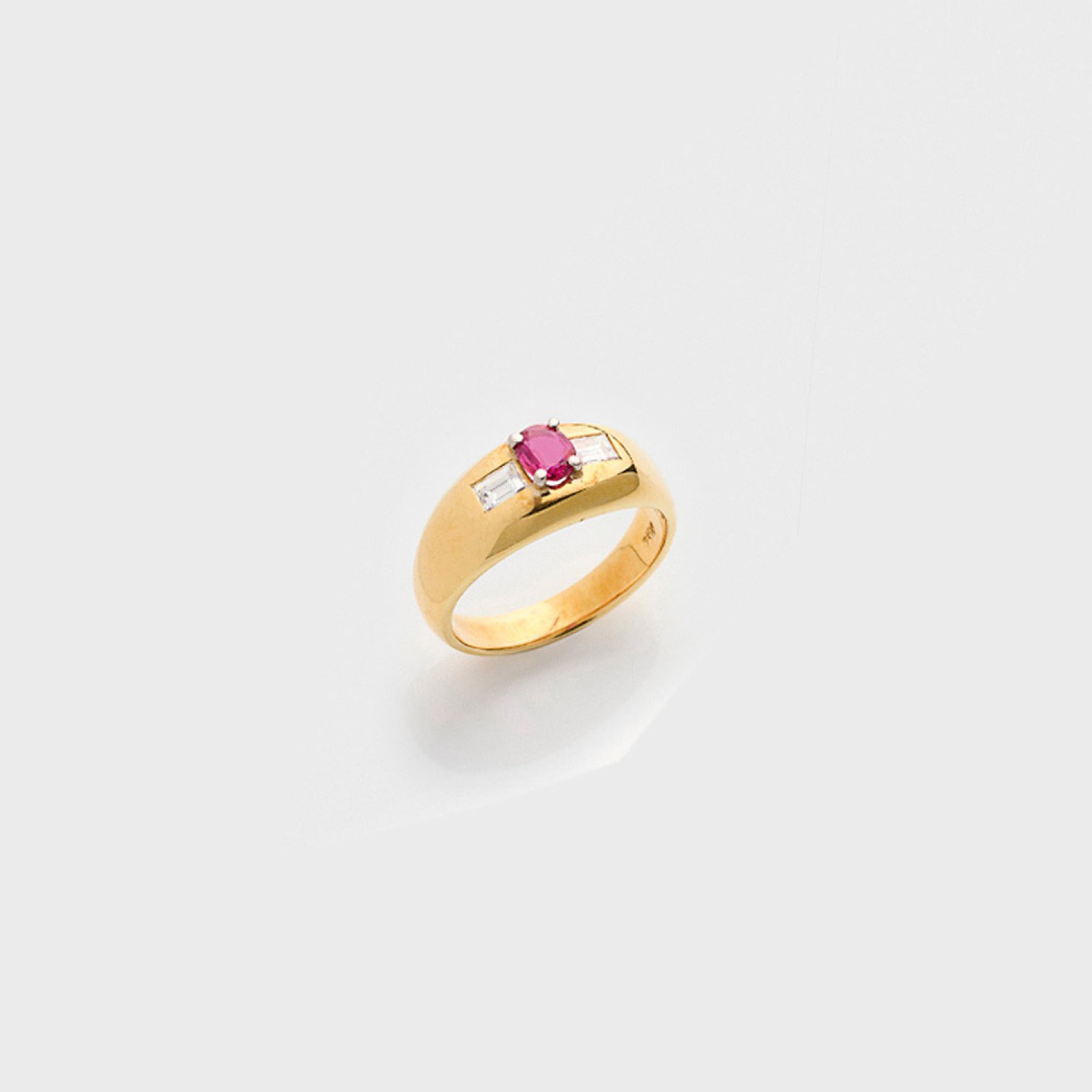 Gelbgold, gest. 750. Zentral besetzt mit einem taubenblutroten Rubin im Ovalschliff von ca. 0,47 ct., flankiert von 2 Diamantbaguetten von zus. ca. 0,36 ct. (vvsi/w). Gew. ca. 6,81 g.