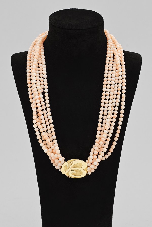 Gelbgold, gest. 750. 6-reihiges Collier aus zartrosafarbenen Korallen-Perlen von ca. 4,6 mm. Ovale Schließe mit erhabenem Monogramm "B".