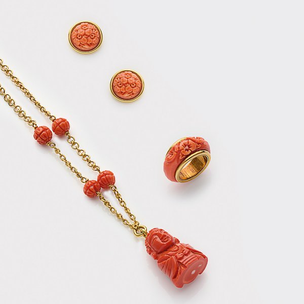 Paar Ohrringe, Ring und Collier. Gelbgold, gest. 585 und 750. Ohrringe und Ring besetzt mit korrespondierend floral geschnitzten, lachsfarbenen Korallen. Collier mit geschnitztem Buddha und Perlen aus Koralle. Ges.-Gew. ca. 46,18 g.