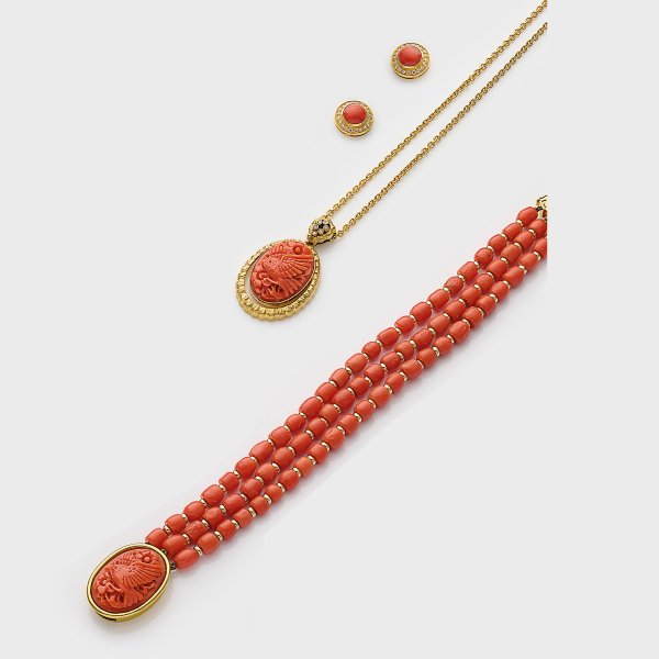 Paar Ohrringe, Armband und Anhänger mit Kette. Gelbgold, gest. 585 und 750. Armband aus Korallen-Linsen von ca. 6 mm, Verschluss mit geschnitzter Sardegna-Koralle besetzt. Anhänger mit korrespondierend geschnitzter Koralle, akzentuiert durch Diamanten von zus. ca. 0,06 ct. (vsi/w). Ohrringe je mit einem runden Korallcabochon besetzt, entouriert von Diamanten von zus. ca. 0,57 ct. (p/w). Ges.-Gew. ca. 57,44 g.