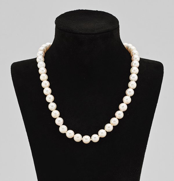 Gelbgold, gest. 750. Einreihige Kette aus Akoyaperlen von ca. 8,5 mm in sehr farbintensivem, rosé-grün changierendem Lüster. Floral reliefierte Schließe besetzt mit Brillanten von zus. ca. 0,25 ct. (vvsi/w). Gew. ca. 48,54 g.