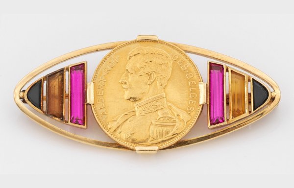 Brooch set with a Belgian 20 francs commemorative coin from 1914, set with yellow and pink sapphires and black onyx, in 18 k gold.