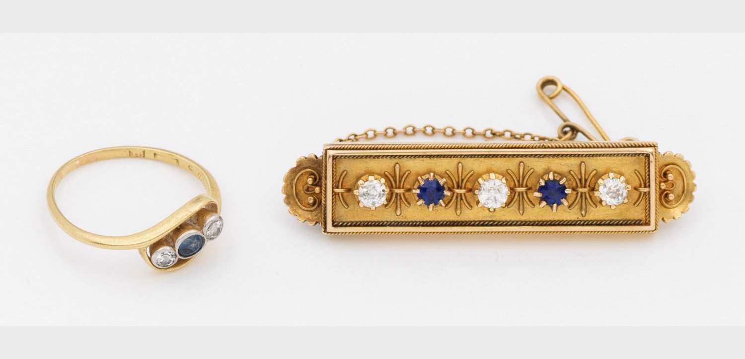 Gelbgold, 14/18 ct.; Besetzt mit Altschliffdiamanten von zus. ca. 0,50 ct. und Saphiren von zus. ca. 0,30 ct.; 18 ct.-Ring-Gew. ca. 2,78 g., 14 ct.-Brosche-Gew. ca. 8,75 g.