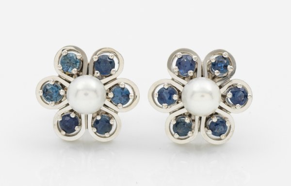Pair of earrings set with culture pearls approx. 5 mm and sapphires approx. 0,60 ct., in 18 k white gold.Abb. im Internet