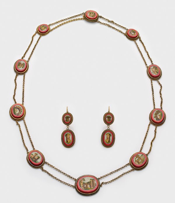 Italien. Um 1860. Collier und korrespondierendes Paar Ohrgehänge. Gelbgold, 14 ct.; Feine, 2-reihige Gliederkette unterteilt durch Medaillons mit Kordelbandfries, darin antikisierende Architekturdarstellungen aus winzigen farbigen Glasmosaiken. Ges.-Gew. 22,40 g.
