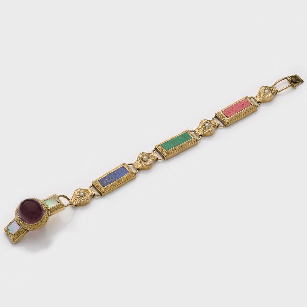 Gelbgold, 14 ct.; Fein floral ziseliertes und graviertes Gliederband, schauseitig besetzt mit Carneol, Lapislazuli, Malachit, Perlmutter und weißen Perlen, mittig himbeerfarbener Turmalincabochon. Gew. ca. 25,85 g.