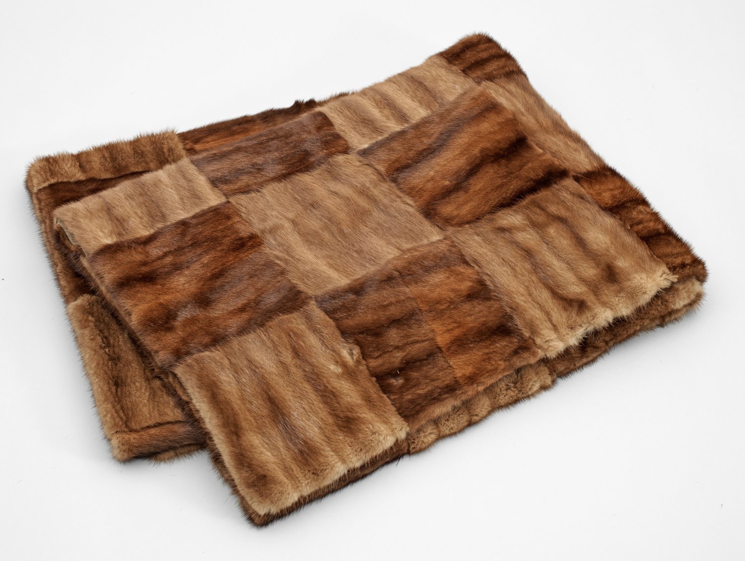 Rechteckige Decke aus mittelbraunem und hell braunem, im Würfelmuster angeordnetem Nerz in ausgelassener Verarbeitung. Rückseite aus beigefarbenem Woll-Cashmere. 207 cm x 141 cm.