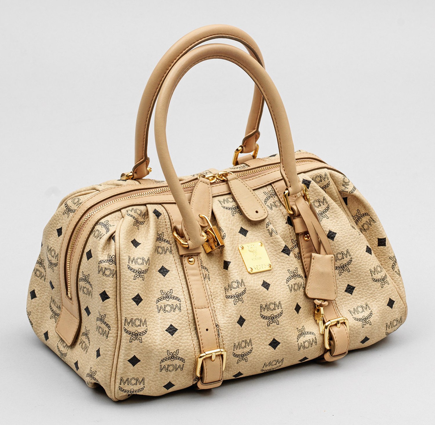 Cremefarbenes Canvas mit MCM-Logo und korrespondierendem Lederbesatz sowie goldfarbener Hardware. Bombierter Korpus mit Reißverschluss und zwei gebogten Handhaben. Innen großes Fach sowie kleine Einsteckfächer. Herstellerzeichen sowie Nr. K9395. Original Staubbeutel. H. 18 cm. 34 cm x 20 cm.