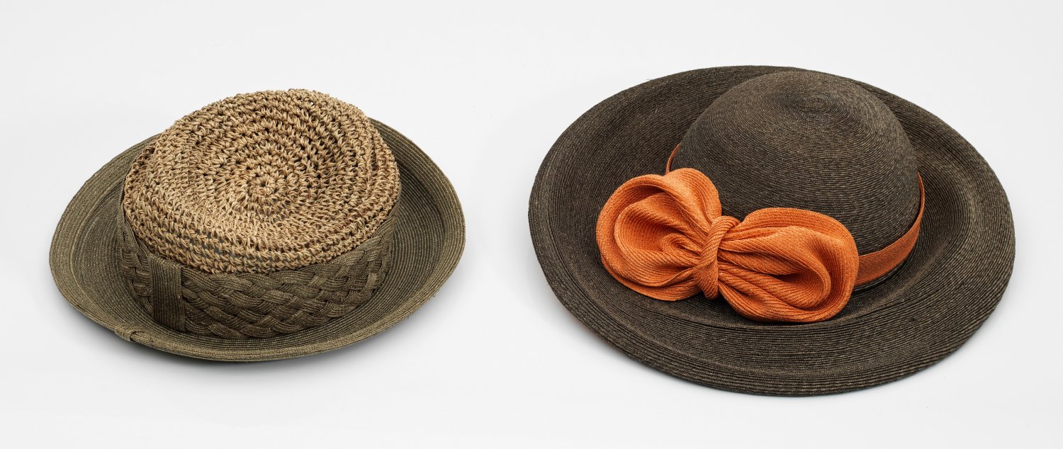 Natur-, oliv- und orangefarbener Bast, unterschiedlich geflochten. Gerundeter Hut mit breiter Krempe sowie einmal mit großem Schleifenmotiv. Herstellerzeichen.