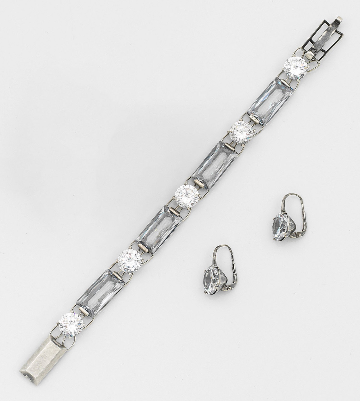Armband und korrespondierendes Paar Ohrgehänge. Silber, gest. 925. Schauseitig besetzt mit großen Strass-Solitären und himmelblauen facettierten Farbsteinen. Herstellerzeichen. Original Box.