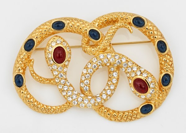 USA, 1990er Jahre. Metall. Dekorativ gestaltet aus zwei ineinander verschlungenen Schlangen, schauseitig besetzt mit roten und blauen Cabochon-Farbsteinen sowie Strassbesatz. Herstellerzeichen. L. 7,5 cm. Original Schmuck-Täschchen.