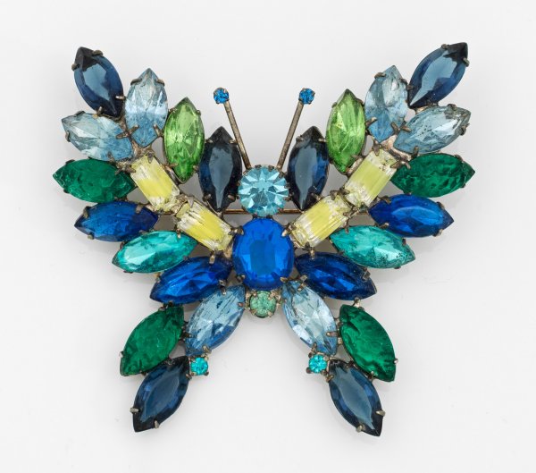 USA, 1990er Jahre. Metall. Dekorativ gestaltet als Schmetterling, ausgefasst mit bunten facettierten Strasssteinen. Herstellerzeichen. L. 7,2 cm. Original Schmuck-Täschchen.