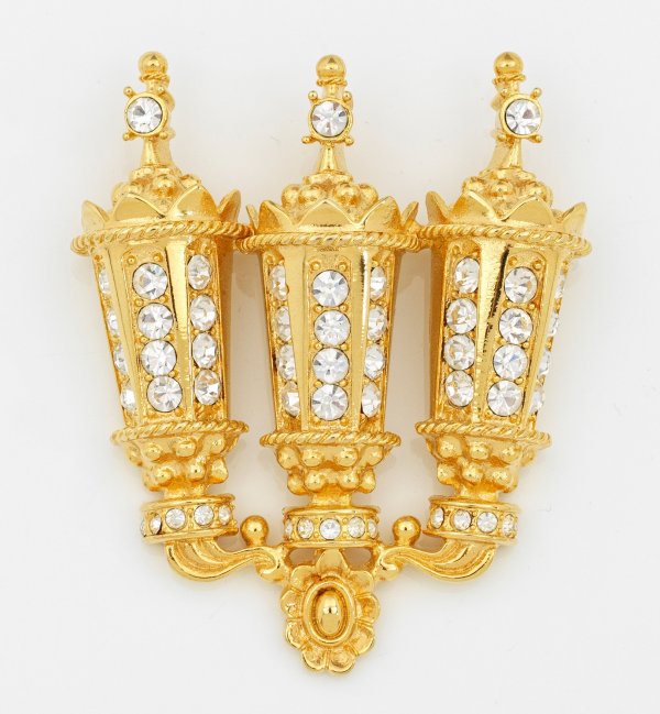USA, 1990er Jahre. Metall. Dekorativ gestaltet aus drei Wand-Laternen, besetzt mit Strass. Herstellerzeichen. L. 6,5 cm. Original-Schmuck-Täschchen.