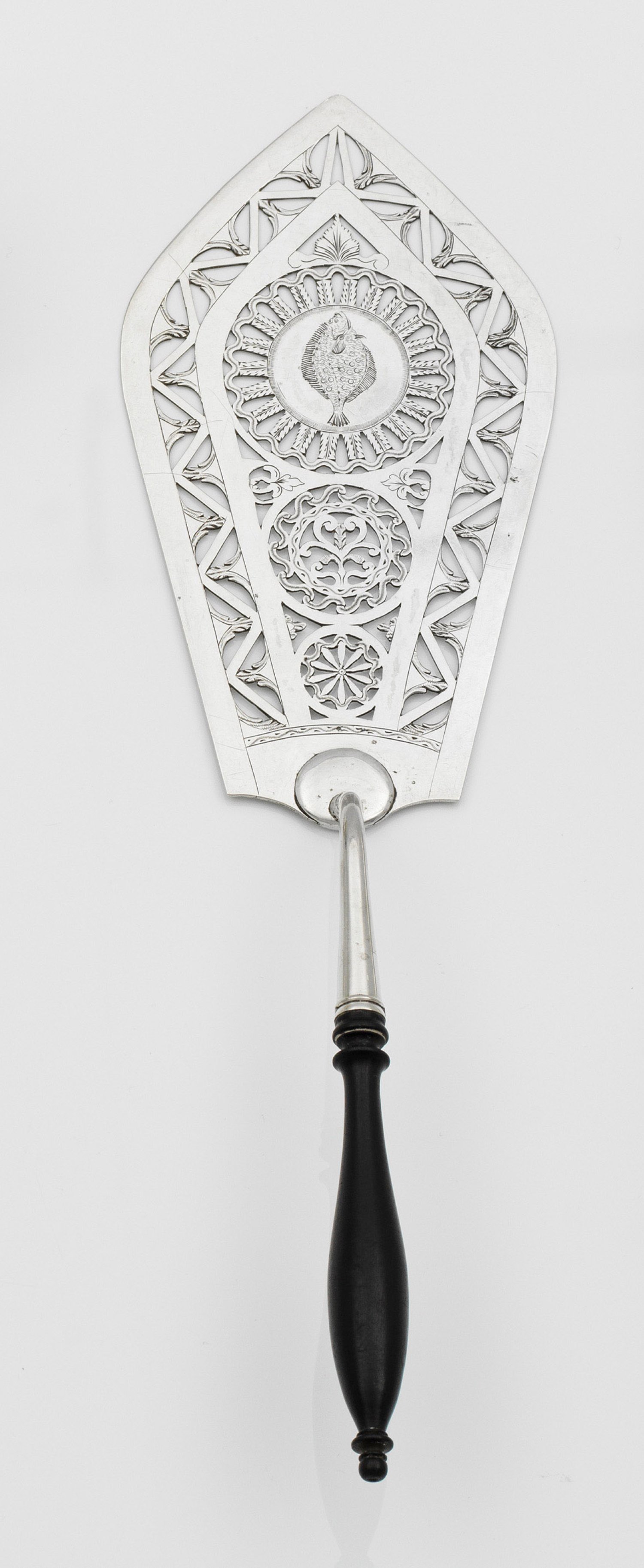 Silber. Spitz zulaufender, breiter durchbrochen gearbeiteter und ziselierter Heber. Zentrales Rundmedaillon mit gravierter Darstellung einer Scholle. Konischer Griff aus ebonisiertem Holz in Balusterknauf endend. Unterhalb punziertes Besitzermonogramm "B. W. 2". Gew. ca. 125 g. L. 34,5 cm.