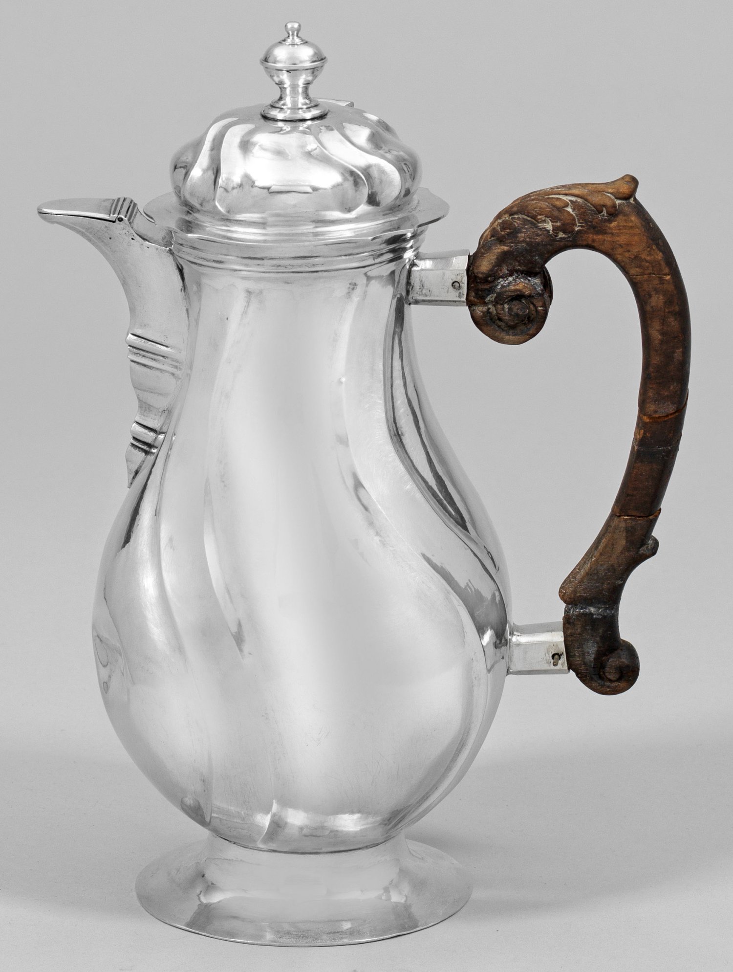Silber. Über trompetenförmigem Stand birnförmiger Korpus mit haubenartig aufgewölbtem, seitlich scharniertem Deckel und Balusterknauf. Mittig angesetzter Konsolausguss mit scharnierter Abdeckung. Wandung und Deckel umlaufend durch passig geschweifte, vertikale Züge gegliedert. Ohrenhenkel am Ansatz mit Blattdekor aus Holz. Gest., Tremolierstrich, Beschauzeichen, Meisterzeichen unbekannter Monogrammist "ISA" (tätig um 1743). Gew. ca. 520 g. H. 24 cm.