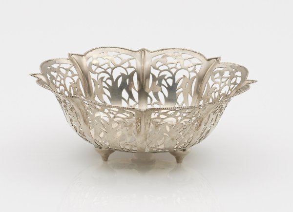Silber. Auf drei spitzen Füßen flacher, runder Spiegel, übergehend in aufschwingende, floral durchbrochen gearbeitete Wandung. Passig geschweifter, von zartem Perlband umzogener Rand. Gest. 800, Herstellerzeichen. Gew. ca. 110 g. H. 5,5 cm. D. 15 cm.