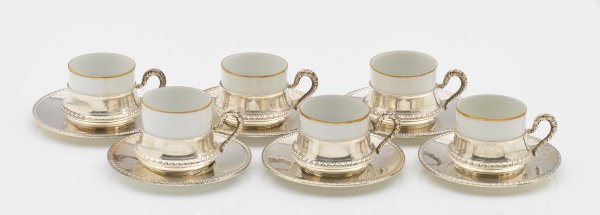 Silber und Porzellan. Gebauchter Korpus mit abgesetzter, von Kordelband umzogener Schulter, übergehend in glatten Hals. Korrespondierende Untertasse. Zylindrische Porzellantasse mit Goldrandverzierung als Einsatz. Teilw. rep.; Gest. 800, Beschauzeichen. Manufakturmarke. Gew. zus. ca. ohne Einsatz: 320 g. H. 5,5 cm.