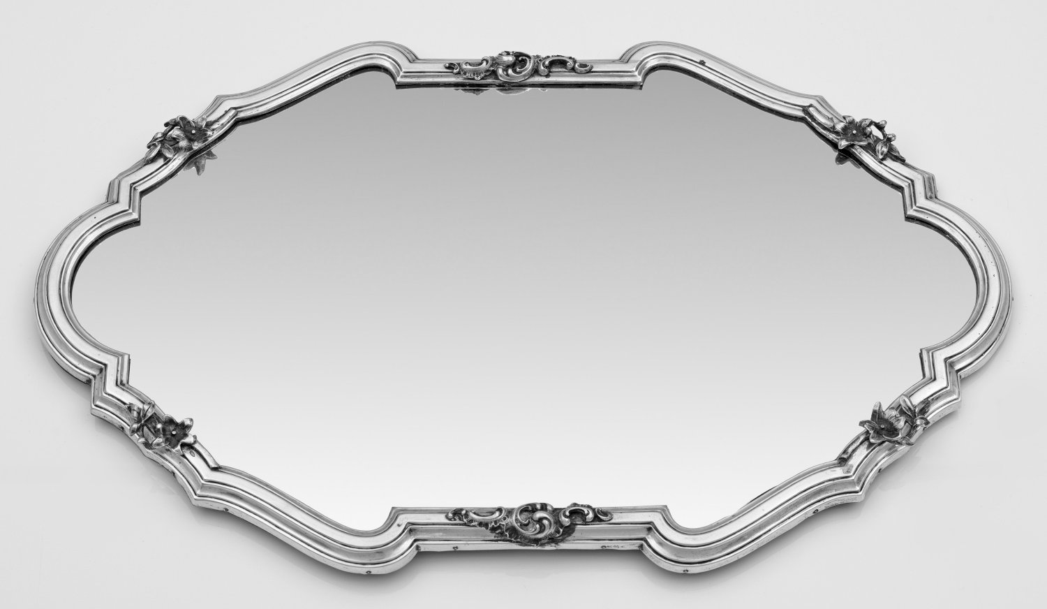 sog. Surtout de table. Mit Silbermontierung. Länglich ovale Spiegelplatte mit passig geschweiftem, mehrfach profiliertem Rand. Darauf applizierte, durchbrochen gearbeitete Rocaillen und Blüten. Die Unterseite mit verschraubtem Holz verkleidet, mit altem Händleretikett. Gest. 800, Beschauzeichen mit Herstellerzeichen und -nummer "32" H. 3 cm. 57 cm x 36,5 cm.