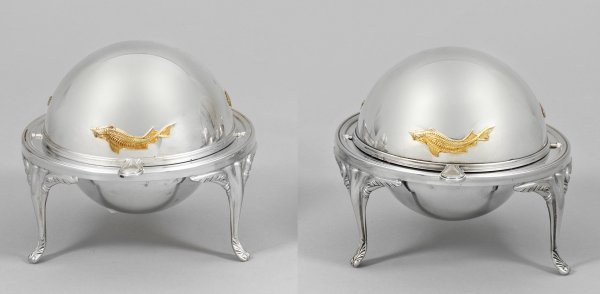 Silber, teilw. vergoldet. Halbrunder Korpus mit ausgestelltem, profiliertem Rand auf drei hohen, gebogten, blattverzierten Beinen. Glatter, scharnierter Klappdeckel schauseitig mit Handhabe und drei applizierten, reliefplastischen Fischen. Glaseinsatz fehlt. Gest. 84, unbekanntes Herstellerzeichen. Gew. zus. ca. 540 g. H. 10,5 cm. D. 12,5 cm.