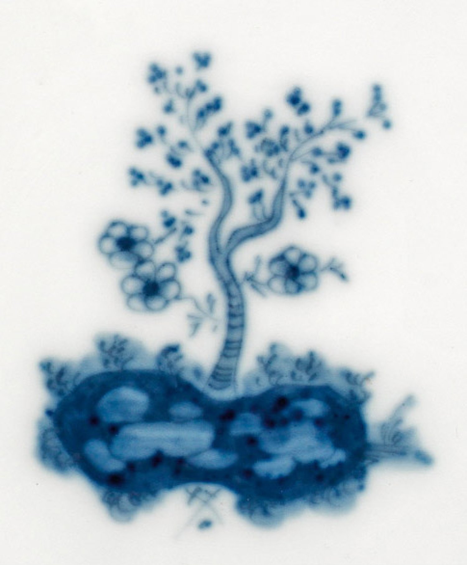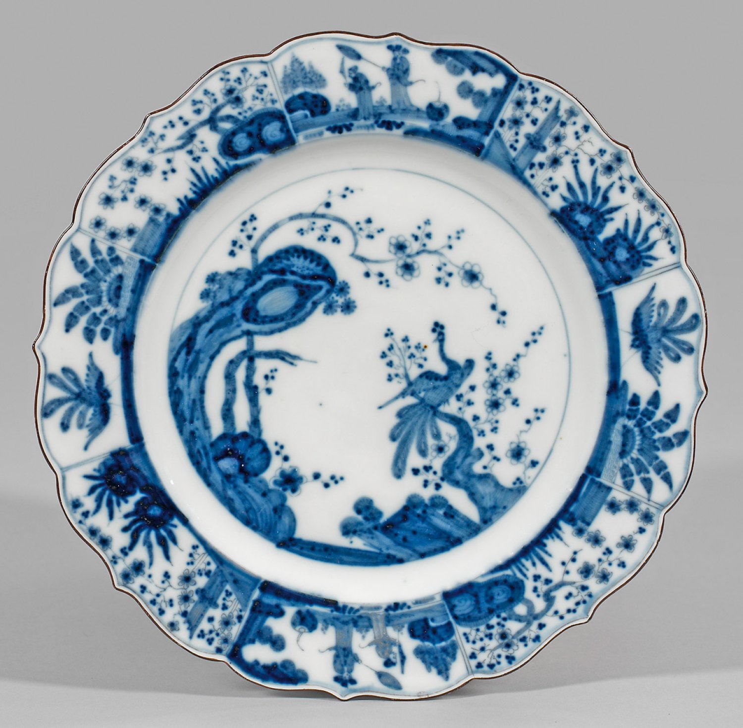Unter einem Prunusbaum sitzender Phönix. Auf der Fahne szenische Darstellungen von Chinesen in blühender Landschaft, sog. Chinoiserien in unterglasurblauer Malerei. Press-Nr. 20. Im Boden Prunusbaum, unterhalb Schwertermarke mit Blaumaler-Sign. "0". D. 26 cm.