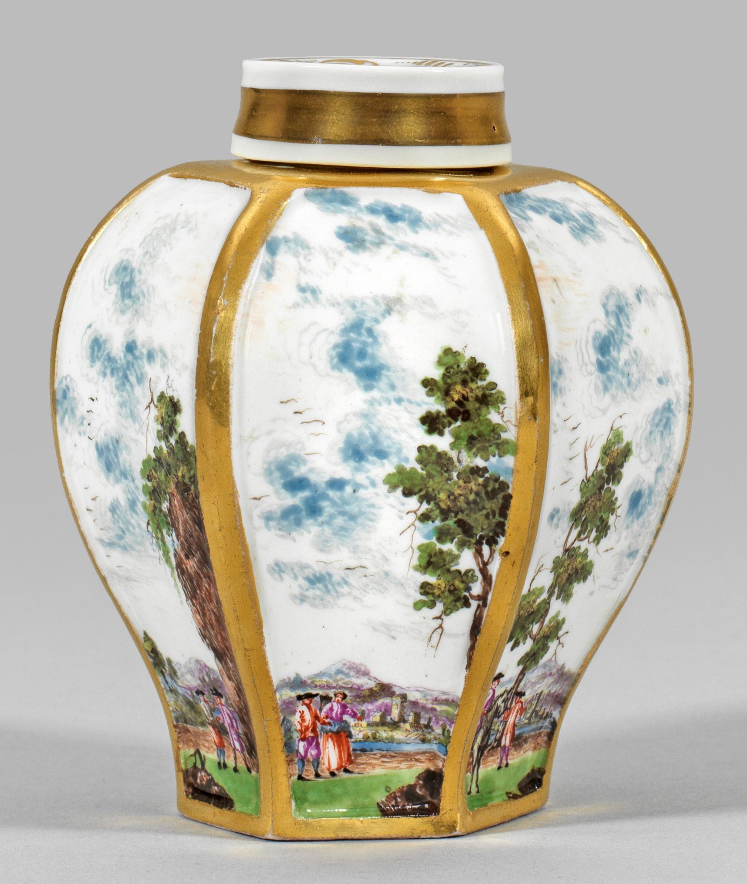 Balusterförmig mit abgesetzter, flacher Schulter und kurzem, zylindrischem Hals. Übergreifender Runddeckel mit Goldornamentik. Umlaufend auf sechs vertieften, profilgerahmten Wandungsfeldern figurenreiche Landschaftsszenen mit Figurenstaffage, teilw. mit Reitern, Pferdekarren, sowie Architekturkulisse in polychromer Malerei, wohl von Christian Friedrich Herold oder Johann Georg Heintze. Profilgrate und Schulter vergoldet. Jeweils Gold-Nr. "65". Schwertermarke in Emailblau. H. 10 cm.