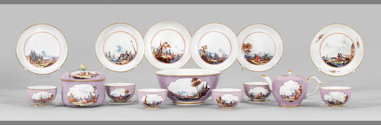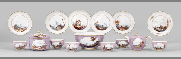 9-tlg.; 6 Koppchen mit Unterschalen, Teekännchen, Bonbonniere und Kumme. Runde Formen. Kugelige Kanne mit blattrelefiertem J-Henkel und Röhrenausguss. Teilw. plastischer Pinien- bzw. Blütenknauf. Auf der Wandung in hellem, lavendelfarbenem Fond ausgesparte, braun konturierte Reserven mit Kauffahrtei- und figürlichen, baumbestandenen Landschaftsszenen. Vor weiter Naturkulisse, teilw. an Flussufern vor Segelbooten und imposanter Architektur stehende Kaufleute unweit von Fässern und Ballen bzw. Paare und Gruppen im Gespräch oder beim Verrichten der Arbeit. Im Spiegel korrespondierende, großflächige, von eisenrotem Doppelring gerahmte Hafenszenen und Darstellungen von ländlichen Gefilden. Feine, polychrome Malerei mit Goldstaffage. Schwertermarke. Kannen-H. 9,5 cm.