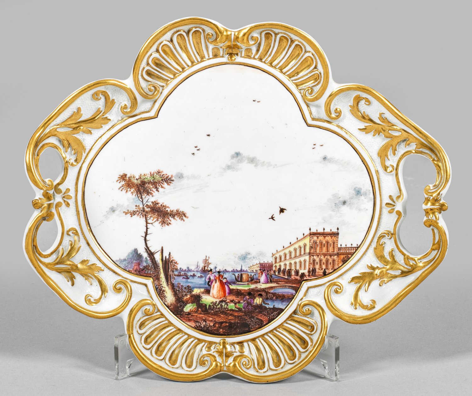 Vierpassig geschweifte, rocailleförmig gerandete Form mit durchbrochen gearbeiteten Henkeln. Reliefierter, gerippter Muschel- und Blattdekor. Im flachen Spiegel profilgerahmte, weite, baumbestandene, venezianische Hafenansicht. Vor Handelsschiffen und imposanter Palazzo-Architektur stehende Rokoko-Paare sowie Figurenstaffage. Nach Kupferstichvorlagen von Melchior Küsel nach J. W. Baur. Außenrand mit Indianischen Blumenzweigen. Polychrome Malerei mit reicher Goldstaffage. Formerzeichen für Andreas Schiefer. Schwertermarke auf unglasiertem Boden. 29 cm x 25 cm.