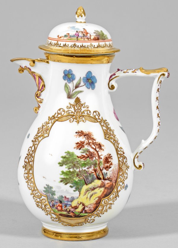 Birnförmiger Korpus. Der J-förmig geschweifte Henkel sowie Schnabelausguss mit reliefplastischem Muschel- und Rocaillewerk sowie Rippen- und Palmettenrelief. Haubenförmiger Deckel mit teilvergoldetem Pinienknauf. Beidseitig der Wandung zwischen großen, ombrierten Holzschnittblumen, vierpassige Reserven, gerahmt von braun konturierter Goldranken- und Gitterwerkornamentik. Darin imposante fels- und baumbestandene Uferlandschaften, im Hintergrund angedeutete Architektur. Korrespondierender Landschaftsdekor mit Goldspitzenbordüre auf dem Deckel. Feine polychrome Malerei von Johann Georg Heintze (tätig 1720 - 1748) bzw. J.G. Klinger (attr.). Gold-Nr. 14. Press-Nr. 11. Minim. rest.; Schwertermarke. H. 22 cm.