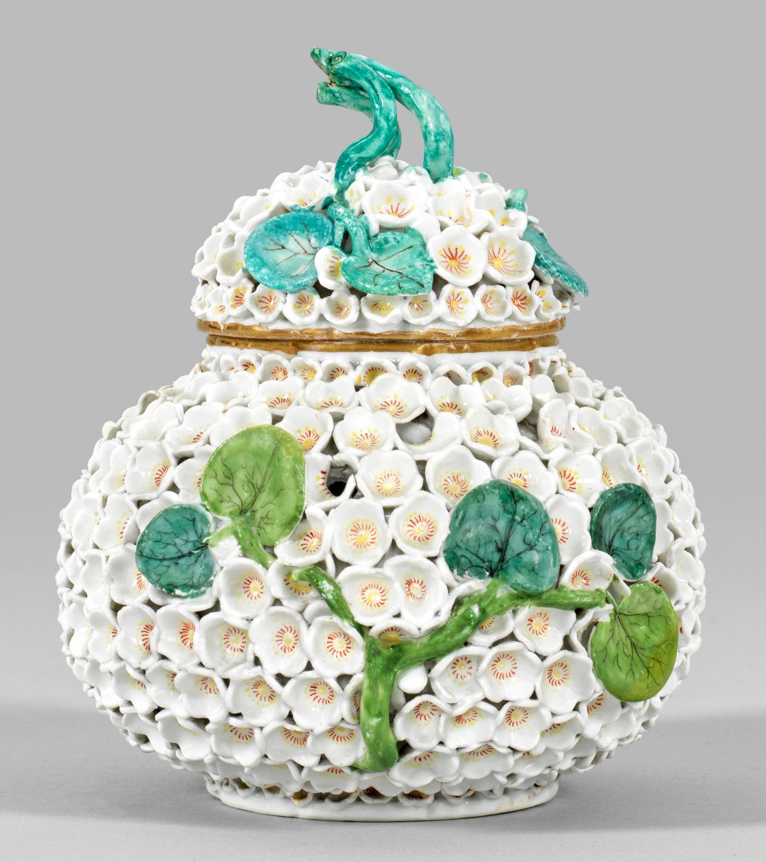 Gedrückter, kugelförmiger Korpus mit gewölbtem, äußerlich kaum sichtbar durchbrochen gearbeitetem Deckel, mittig großer Rankenknauf. Auf der Wandung und dem Deckel dichter Fond aus plastisch aufgelegten, einzeln bossierten Schneeballenblüten, durchzogen von Blattranken. Polychrome Malerei. Goldrand. Entw. Johann Joachim Kaendler. Minim. best.; Verwaschene Schwertermarke. H. 14 cm.