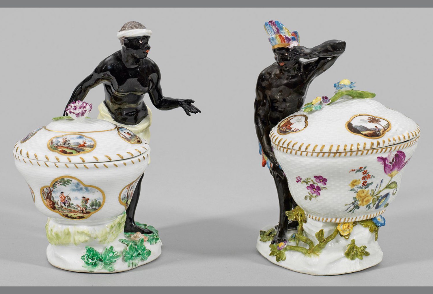 Auf einem mit plastischen Blättern und Blütenranken belegtem Felssockel mit Baumstumpf, stehender Mohr mit Lendenschurz und Kopfschmuck aus farbig staffierten Federn bzw. Mohrin in blumengemusterter Kleidung und Stirnbinde. Seitlich stehendes, ovales Gefäß mit gewölbtem Deckel, mittig Blütenknauf. Auf der Wandung und dem Deckel Ozier-Relief mit feinen Blumenarrangements bzw. in vierpassig ausgesparten Reserven gerahmte Kauffahrtei- und Jagdszenen. Polychrome Malerei mit Goldkonturierung. Entw. Johann Joachim Kaendler und Johann Friedrich Eberlein. Unw. rest.; Schwertermarke. H. 17 cm.