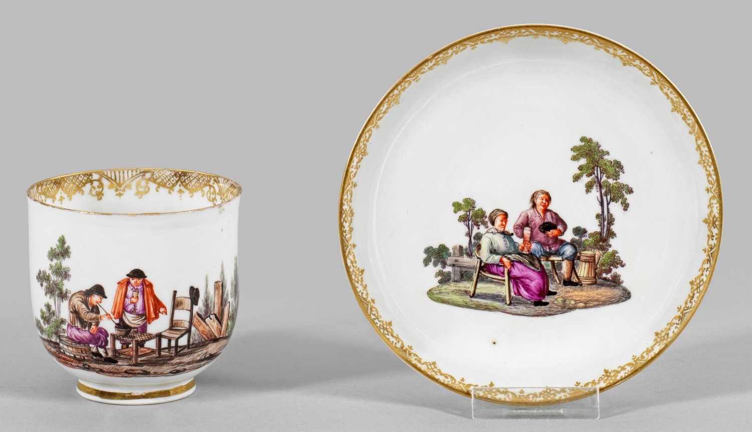 auf Untertasse. Becherförmiger Korpus mit Rocaillehenkel. Auf der Schauseite und im Spiegel szenische Darstellung mit sog. Teniersbauern in baumbestandener Landschaft. Teilw. Holzschnitt-Blumendekor. Polychrome Malerei mit breiter Goldspitzenbordüre. Teilw. Dreherzeichen für Johann Gottlieb Kühnel Sen. (tätig seit 1732) bzw. Former-Nr.; Goldzeichen bzw. -Nr.; Schwertermarke. H. 7 cm.
