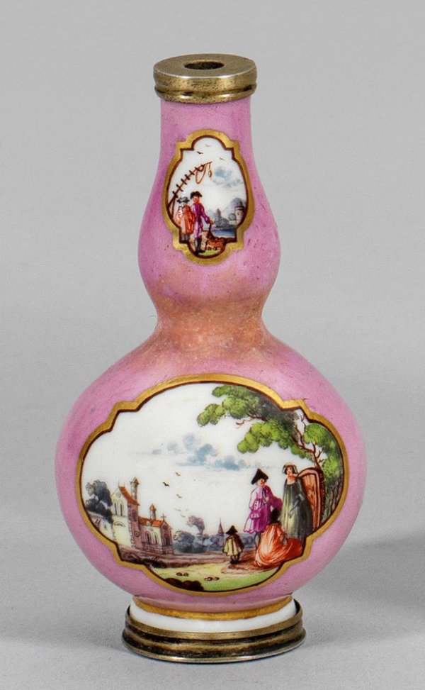 Kalebassenform. Beidseitig der Wandung, in Purpurfond ausgesparte Vierpassreserven mit Kauffahrteiszenen und Landschaften in polychromer Malerei. Montierung, gest.; Ohne Stopfen. Rest.; Schwertermarke H. 7,5 cm.