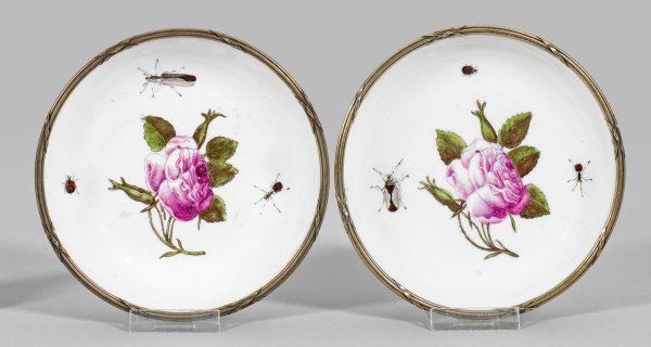 Runde, vertiefte Form. Im Spiegel blühender Rosenzweig, umgeben von ombrierten Insekten in der Art von J. G. Klinger in polychromer Malerei. Ornamentierte Randmontierung aus Metall. Schwertermarke. D. 13,5 cm.
