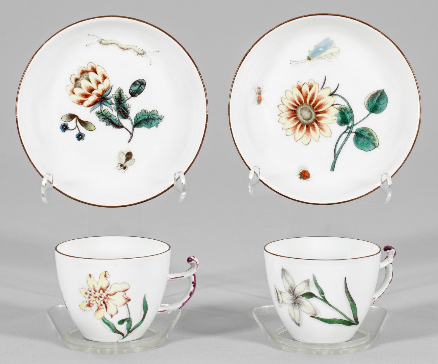 A pair of porcelain cups and saucers finely painted with "woodcut flowers" and shadowed insects in the manner of J. G. Klinger. Painter's mark. Chipped. Crossed swords mark.
