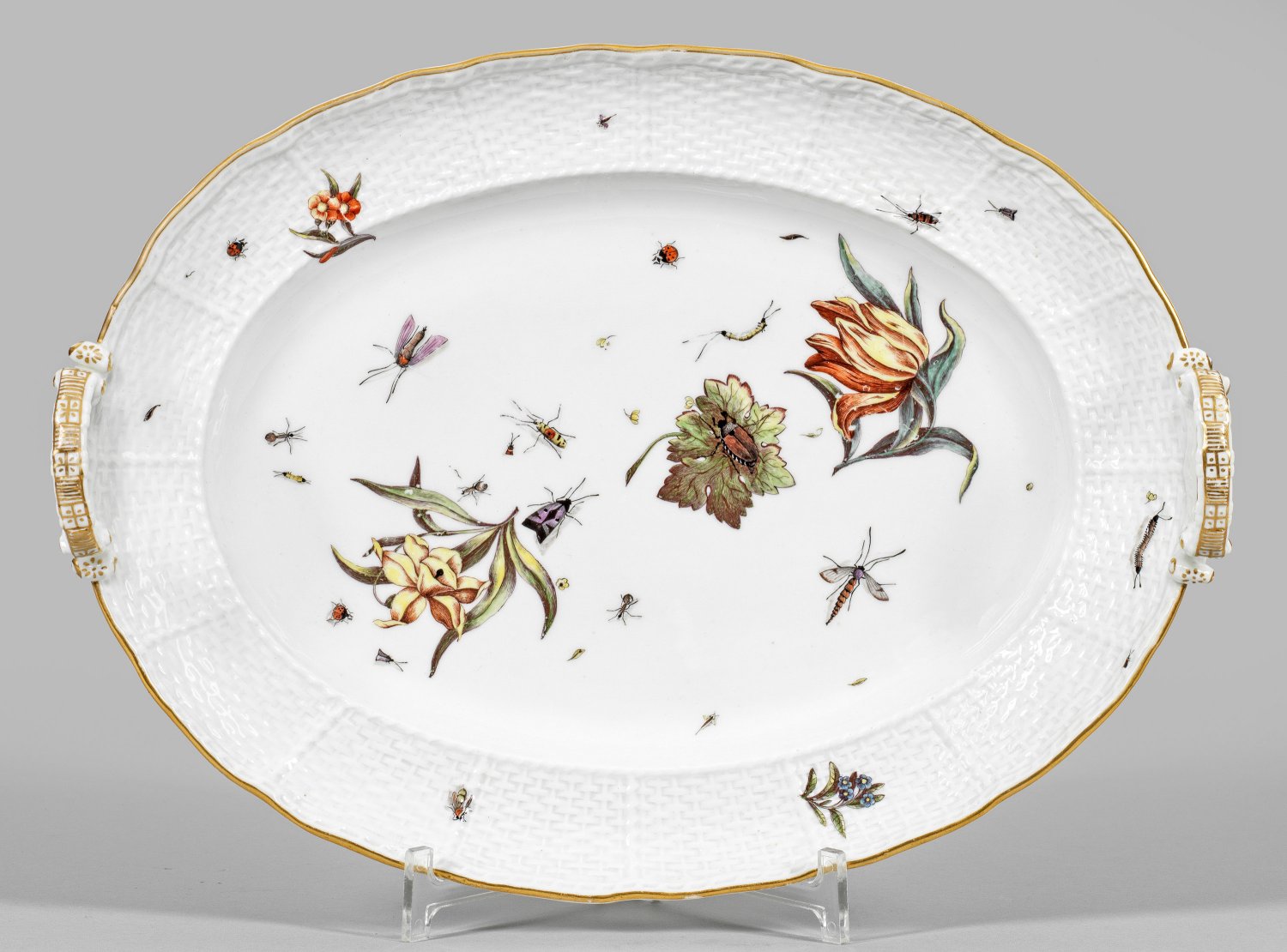 Ovale Form mit wellenförmig geschweiftem Rand. Seitlich ansetzende, goldornamentierte Volutenhenkel. Reliefdekor "Altozier". Im vertieften Spiegel große sog. Holzschnittblumen umgeben von ombrierten Insekten und gestreuten Blumen. Korrespondierender Blüten- und Insektendekor auf der Fahne und auf der Außenwandung. Polychrome Malerei wohl von Johann Gottfried Klinger (tätig 1726 - 1746). Goldrand. Schwertermarke. H. 8 cm. 40 cm x 29 cm.