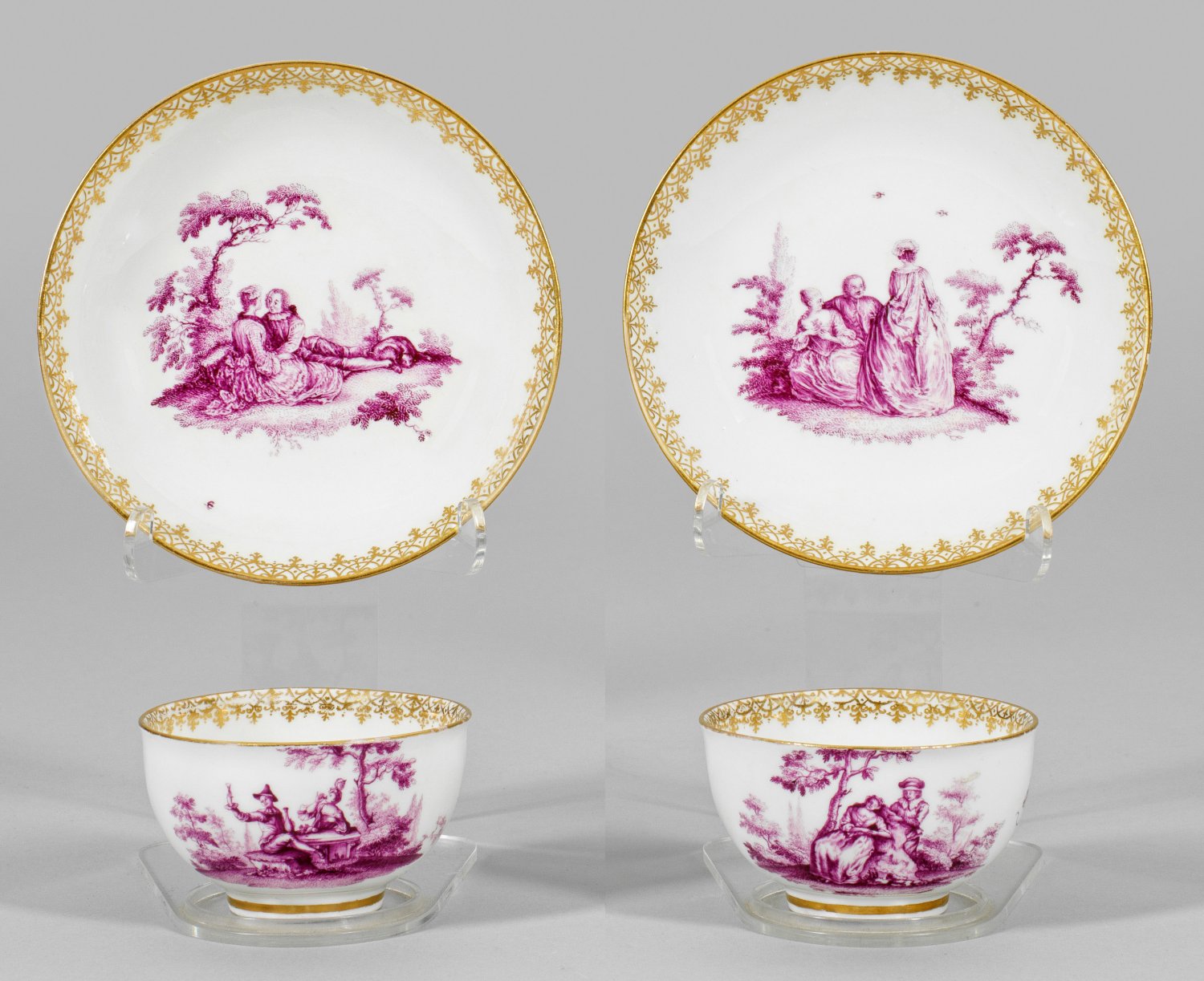 auf Unterschalen. Halbkugelige Form. Beidseitig der Wandung und im Spiegel großflächige Szenen mit höfischen Paaren in baumbestandener Landschaft, teilw. mit Komödianten- und Pierrotdarstellung nach Watteau, im Wechsel mit Blütenzweigen. Purpurfarbene Camaieumalerei. Umlaufende Goldspitzenbordüre. Gold-Nr. 93. Schwertermarke. H. 4,5 cm.