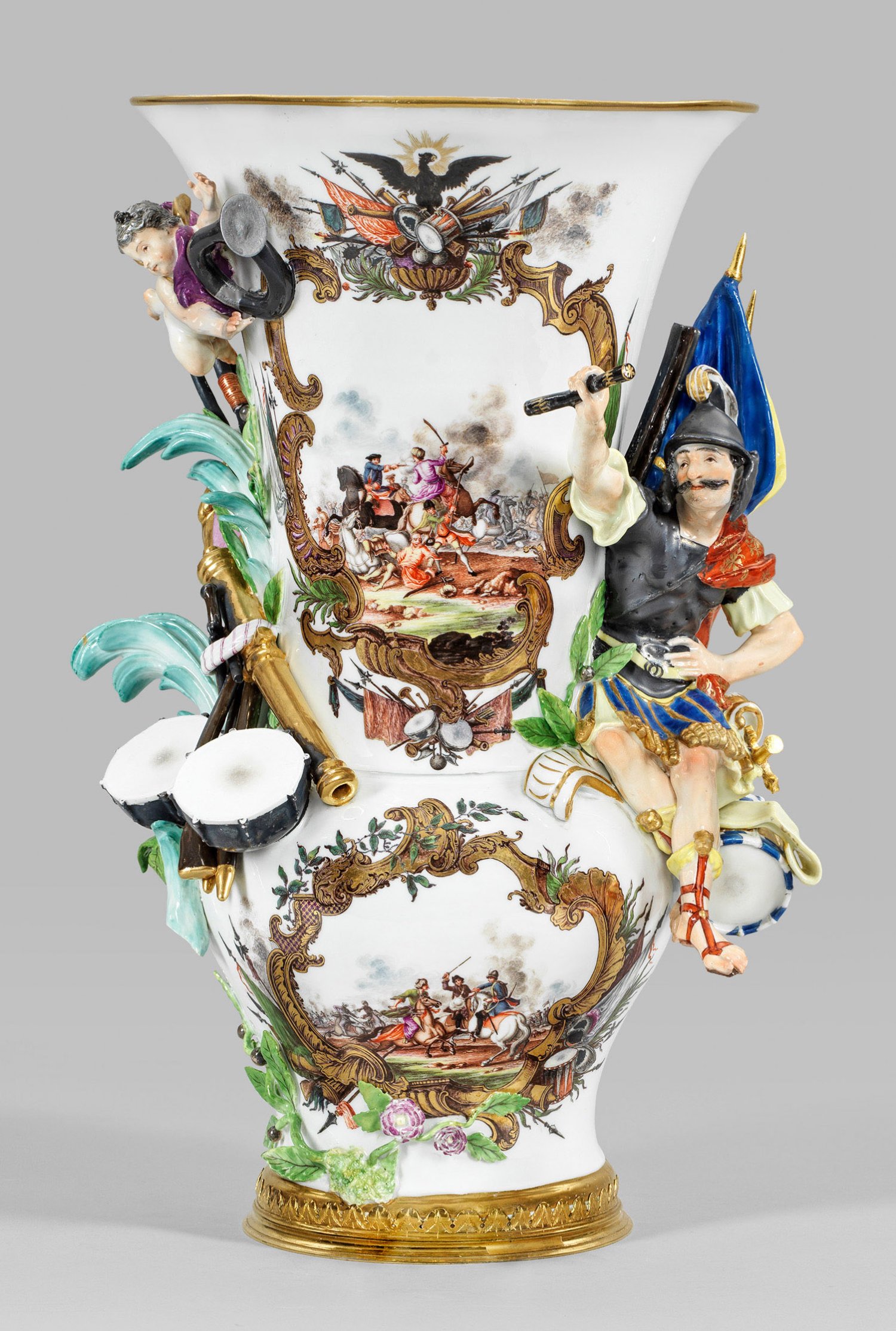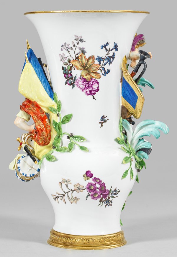 (sog. Marsvase) aus der Serie der Planetenvasen. Ringförmige Fußmontierung mit Blattbordüre aus vergoldeter Bronze. Über rundem, leicht eingezogenem Stand gedrungener, bauchiger Korpus mit abgesetztem, langem, trompetenförmigen Hals und ausschwingendem, glatten Rand. Auf der gerundeten rechten Schulter, vor Fahnen sitzender Kriegsgott Mars in römischer Rüstung mit Helm und seitlich gegürtetem Schwert. In der emporgestreckten rechten Hand einen Marschallstab haltend. Gegenüber, zwischen plastischen Palmen- und Lorbeerzweigen, aufbossierte Kriegstrophäen, u.a. Gewehre und ein Kanonenrohr, Trompete und Fahnen. Darüber ein schwebender Putto mit Blashorn. Auf der Schauseite kräftige, im Detail filigran gestaltete und von Kriegstrophäen und Rankenwerk umzogene Rocaillekartuschen. Darin bewegte Bataillenszenen in äußerst feiner polychromer Malerei, wohl von Johann Georg Heintze (tätig um 1720 – 1748) nach Georg Philipp Rugendas. Auf der Rückseite großflächige Gebinde aus Holzschnittblumen. Entw. Johann Joachim Kaendler und Johann Friedrich Eberlein, 1744. Staffage wohl von Christoph Gottlob Häntzschel. Press-Nr. 21. Partiell rest.; Schwertermarke. H. 43 cm.