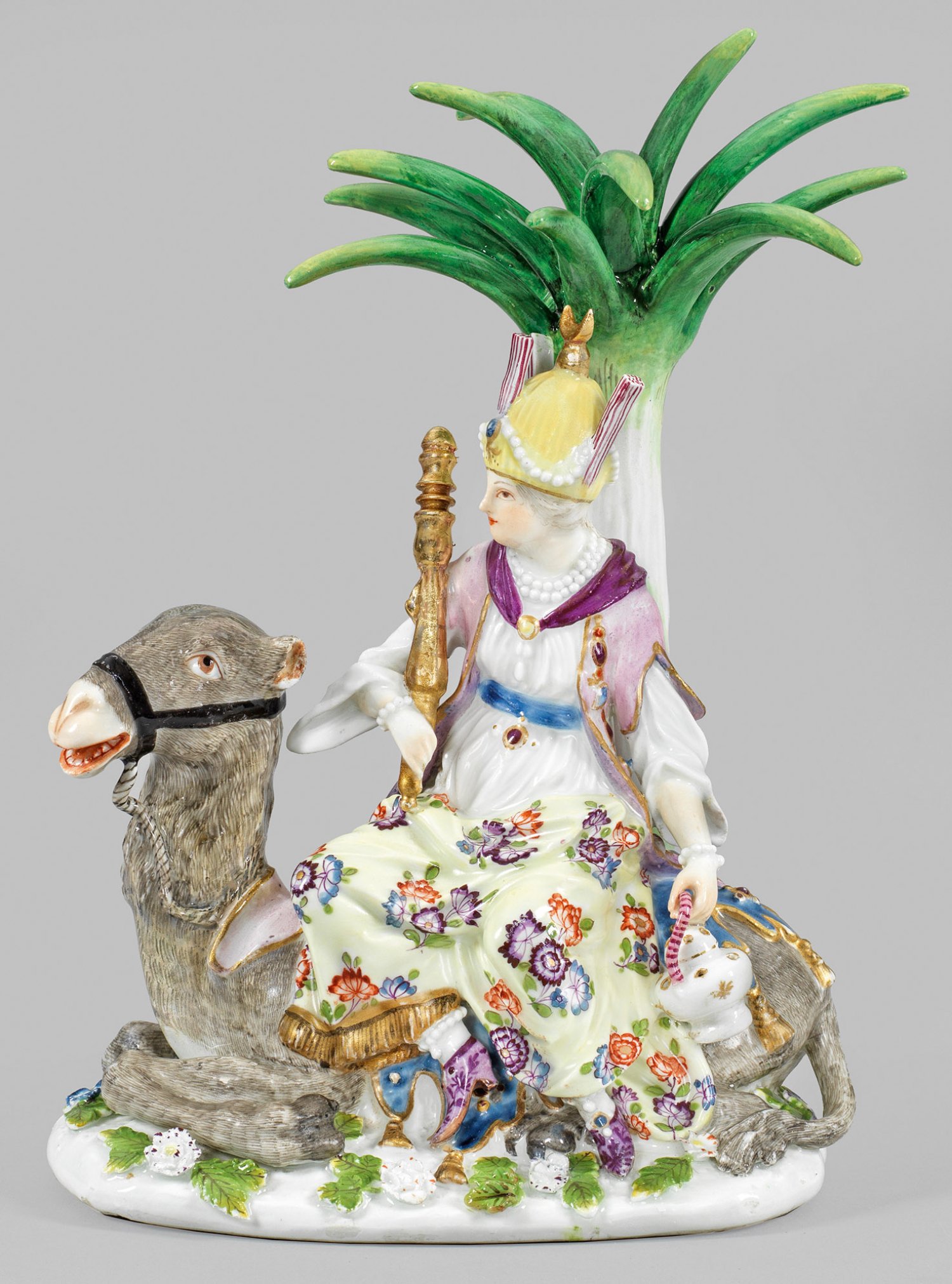 aus der Serie "Vier Erdteile". Mit plastisch aufgelegten Blüten und Blättern naturalistisch gestalteter Sockel. Unweit einer Palme, auf einem Kamel sitzende, junge Orientalin in einem blumengemusterten, weißen Kleid, purpurfarbenem Mantel und haubenartiger, aufwendiger Kopfbedeckung, den Kontinent Asien personifizierend. In der linken Hand ein Räuchergefäß, in der rechten Hand ein Zepter haltend. Polychrome Malerei mit Goldstaffage. Entw. Johann Joachim Kaendler. Rest.; Schwertermarke. H. 20,5 cm.