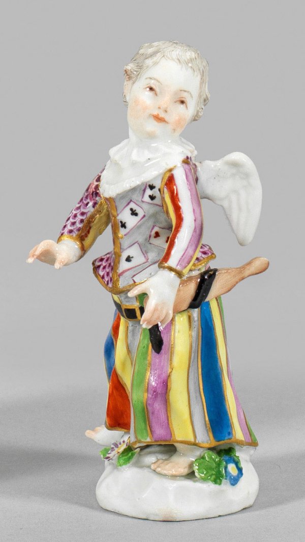 auf rundem, mit plastischen Blüten und Blättern belegtem Rundsockel. Gekleidet in farbiges Oberteil mit Schuppen- und Spielkartenmuster sowie gestreiftem Rock. Seitlich gegürtete Pritsche. Entw. J. J. Kaendler. Rest.; Verwaschene Schwertermarke. H. 8,5 cm.