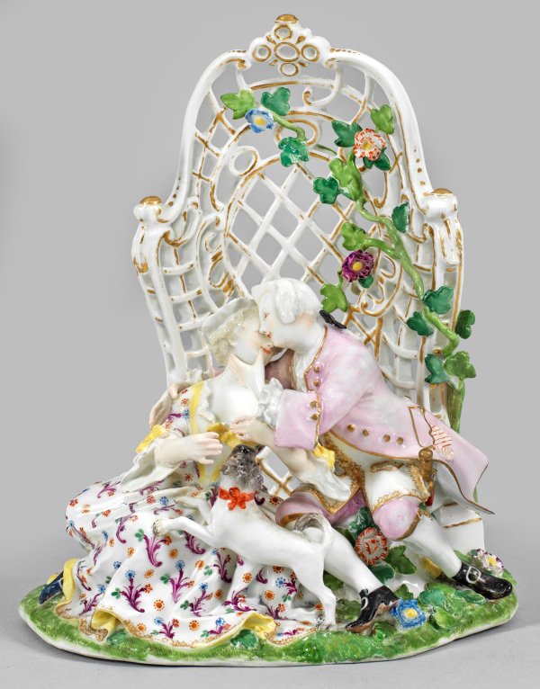 Auf unregelmäßigem, von plastischen Blüten und Blättern belegtem Sockel sitzendes, sich umarmendes Liebespaar vor rocailleförmiger, gitterartig durchbrochen gearbeiteter Laubennische, umzogen von feinplastisch aufgelegten Blumenranken. Die Dame in weißem, floral gemustertem und goldgesäumtem Kleid mit Spitzenhaube, der junge Herr in roséfarbenem Anzug über weißer, goldverzierter Weste. Zu ihren Füßen ein aufspringender Mops mit roter Halsschleife. Polychrome Malerei mit Goldstaffage. Entw. Johann Joachim Kaendler, um 1745. Minim. rest./best.; H. 19 cm.