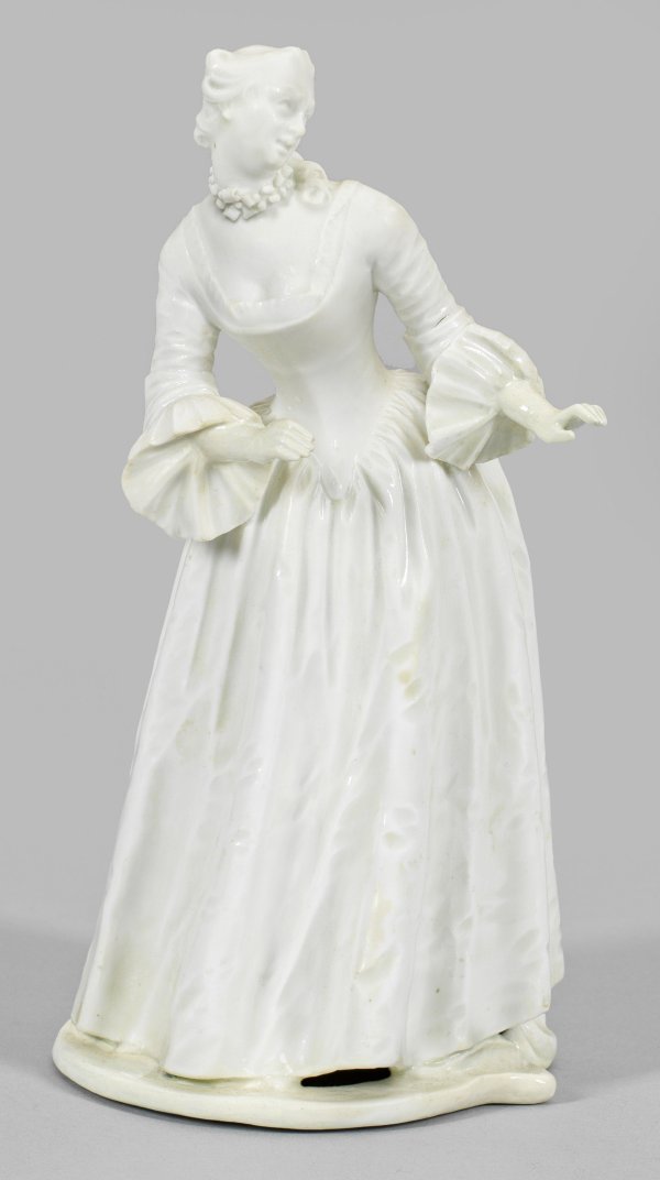 Weißporzellan. Auf flacher Rocailleplinthe stehende Isabella in höfischer Kleidung, den Oberkörper leicht nach vorn gebeugt, den Kopf nach links gewandt. Entw. Franz Anton Bustelli, 1759/1760. Rest.; Eingepresste Manufakturmarke. H. 19,5 cm.