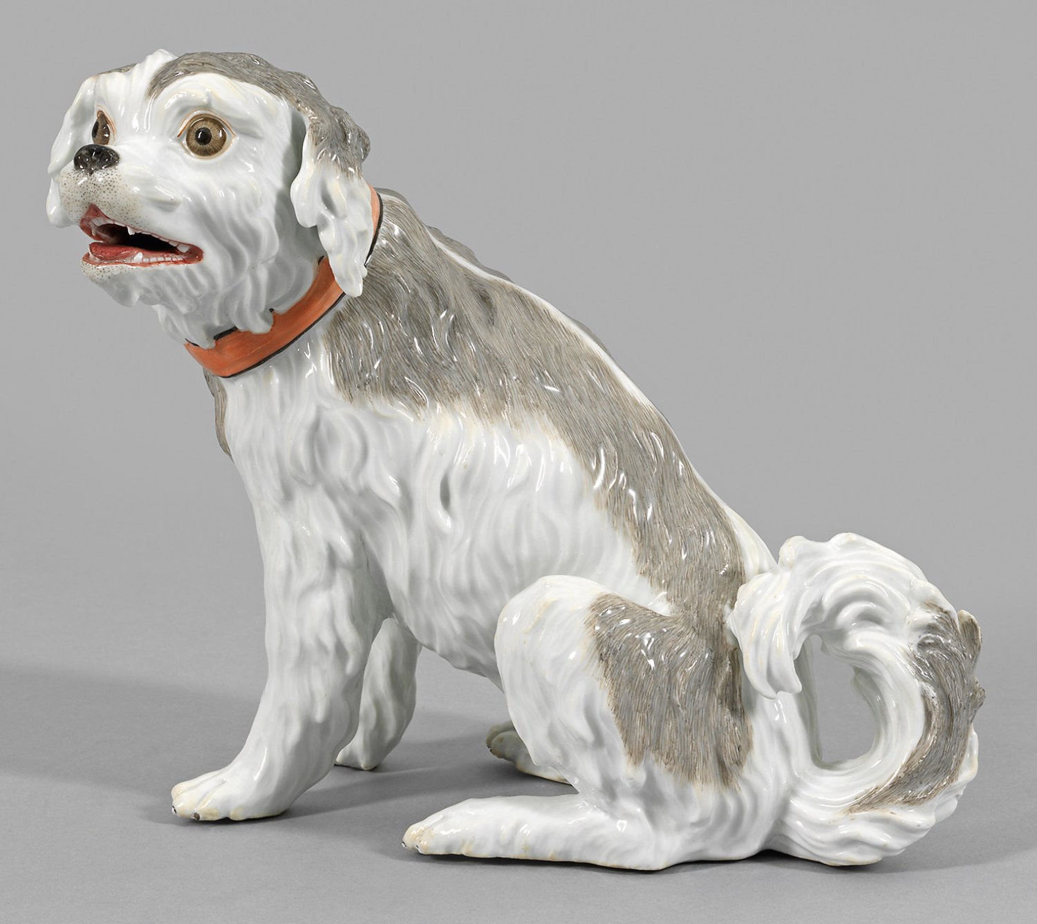 Auf seinen Hinterpfoten sitzender Bologneser, nach links gerichtet. Reliefplastisch gearbeitetes, grau geflecktes, weißes Fell. Polychrome Malerei. Unw. best./rest.; Entw. Johann Joachim Kaendler. H. 19 cm.