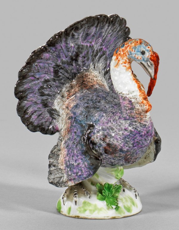 aus dem sog. "Holländischen Dorf". Auf leicht gehöhtem Natursockel stehender, balzender Truthahn, die Schwanzfedern fächerartig aufgestellt. Naturalistisch gezeichnetes Federkleid. Polychrome Malerei. Entw. Johann Joachim Kaendler. Minim. rest./best.; Schwertermarke. H. 10,5 cm.